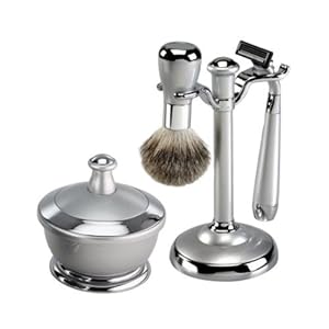 Silver Metal Finish Shaving Set With Mirror Shaving Bowl