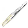 Stainless steel tweezers for precision hair removal from the brow and facial area. The slanted tip provides the option to remove large amounts of hair or turn around and use the tip for removal of individual hair.