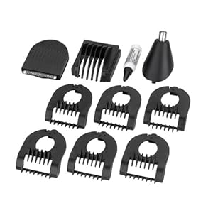 Five-position comb guide for cutting lengths 4 mm, 6.5 mm, 9 mm, 11.5 mm and 14 mm. Three stubble combs. Three Jaw line blending combs 1 mm, 2 mm and 3 mm