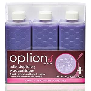 Depilatory Lavender Shimmer Creme Wax with a low operating temperature. A quick, accurate and hygienic method of wax application for salon professional hair removal, where wax is rolled onto the skin. Key Features Excellent for strong & fine hairs. Contains Lavender Oil, known for it’s excellent soothing properties. Lavender Oil helps to heal & repair the skin. Rich colour & relaxing aroma of lavender. Low operating temperature & shimmer appearance. Enables quick, easy waxing results & creates less mess. This wax provides a thin, economic application. Suitable for use in Options by Hive Multi Pro & Hand Held 80g Heaters. Specification Plastic Cartridges Guidelines Professional tips for use: 1. Remove cap, attach chosen roller head and turn until tight. 2. Turn the cartridge upside down to allow the wax to flow smoothly into the roller head. 3. Angle the cartridge at about 45 degrees, roll on a thin application of wax in the direction of hair growth. Return cartridge to the heater. 4. Press epilating strip to the waxed area. 5. Pull off the strip with a firm action against the direction of hair growth. This creme wax has a low operating temperature therefore your heater can be set at a slightly lower temperature than if you were using a warm ‘honey’ wax. Care Instructions Once opened, use within 36 months. Store in a cool, dry place.