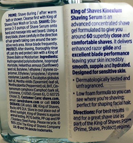 This King of Shaves Sensitive Shaving Serum is an advanced concentrated shave gel, combining the incredible performance of our shaving oils with the ease of use of our shaving gels. Our Sensitive shaving serum delivers amazing razor glide and a close, comfortable shave from a handy compact bottle you can take (almost) anywhere. Ideal for sensitive skin it will leave your skin smooth and supple and feeling great. Formulated to give you 60+ superbly close and comfortable shaves. It delivers enhanced razor glide and excellent blade performance leaving your skin incredibly smooth, supple and hydrated, not dry and tight. All King of Shaves shaving gels, oils, serums and cream work great with all popular razor brands including; Gillette Fusion, Proglide, Mach 3 and Wilkinson Sword Hydro, Quattro and Protector.