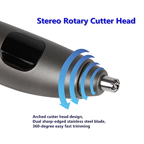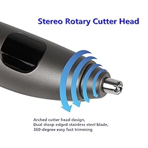 Our wet dry nasal hair trimmer and personal groomer is equipped with ultra-sharp and durable Dual-Edge stainless steel blades of outstanding strength and speed that softly and easily cut unwanted nose or ear hair from a variety of angles while protecting your skin from pain or injury. Improved cyclone blade action of the rotary blade system brings you efficient and precious trimming with no pulling sensation.