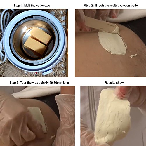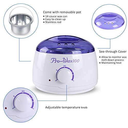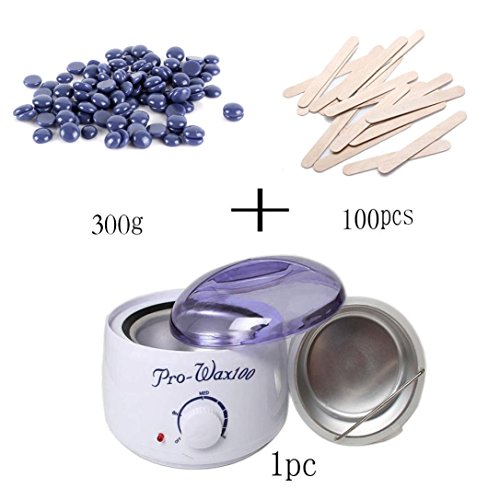 This waxing kit includes a wax warmer,1 bag wax beans and 100 Pcs sticks — Wax warmer is suitable for most wax types — Hard wax, soft wax, strip wax, loose wax, paraffin waxing and so on. Great ideal for removing hair of body and facial (except sensitive or injured skin).By the effect of warming, this machine can put the rich vitamins, collagens into the skin effectively.